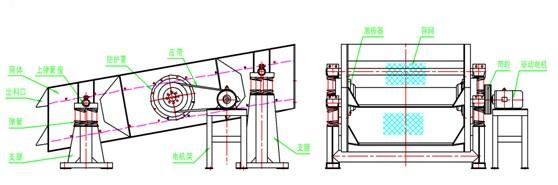 该系列筛机为座式安装。筛面倾角的调整可通过改变弹簧支座位置高度来实现。